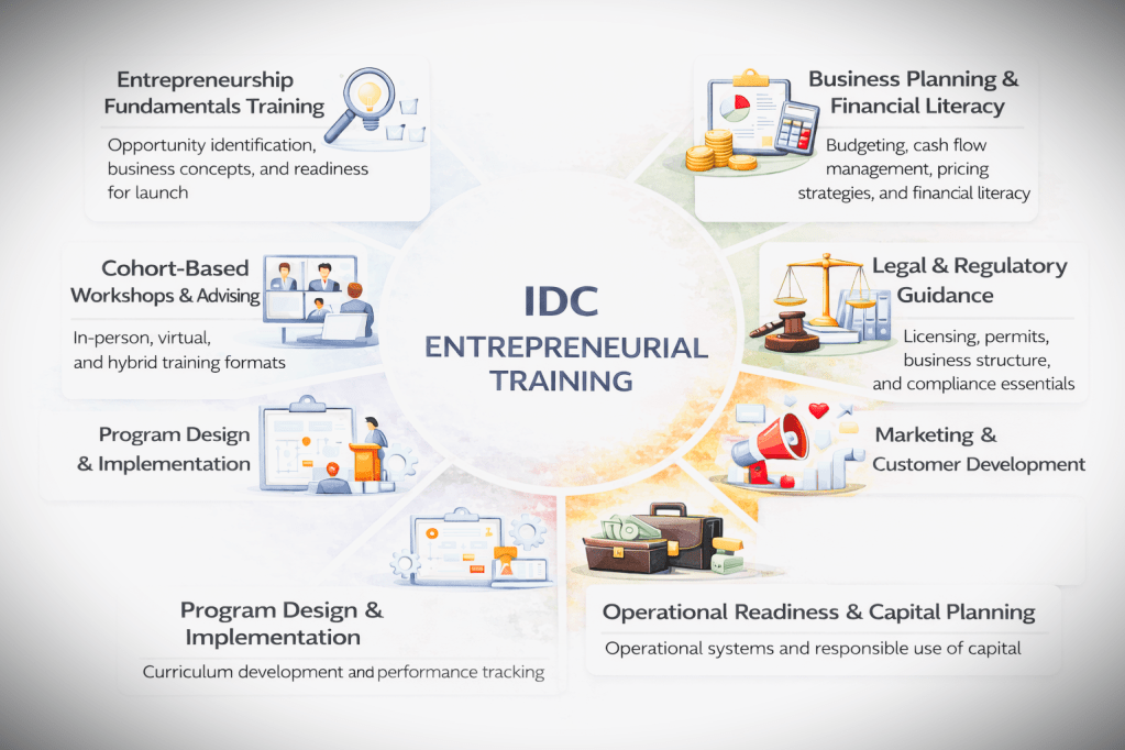 IDC partners with public agencies, educational institutions, workforce systems, and community organizations to design and deliver entrepreneurial training and technical assistance, including: